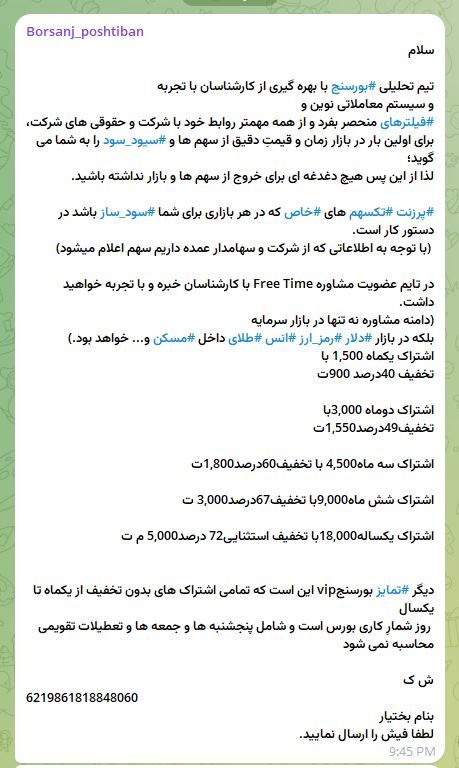 به هر حال من دیگه برای رفتن کلاه به سرم آماده شده بودم و ۹۰۰ هزار تومن بیزبون رو به حساب آقای حسن بختیاری با شماره کارت 6219861818848060 واریز کردم که وارد کانال VIP بورسنج بشم.