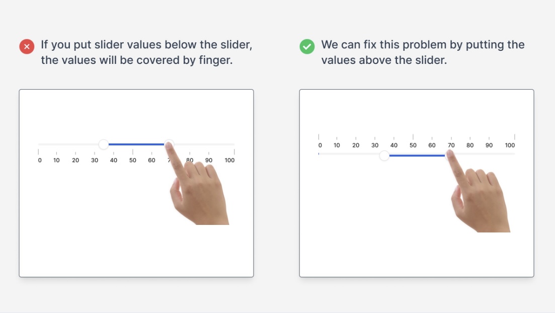 در خیلی از طراحیها اندازهی هندل اسلایدر یا فاصله اطرافش برای لمس مناسب نیست. کاربر وقتی میخواد با انگشت حرکت بده، هندل زیر انگشتش گم میشه یا دقت حرکت پایین میاد.