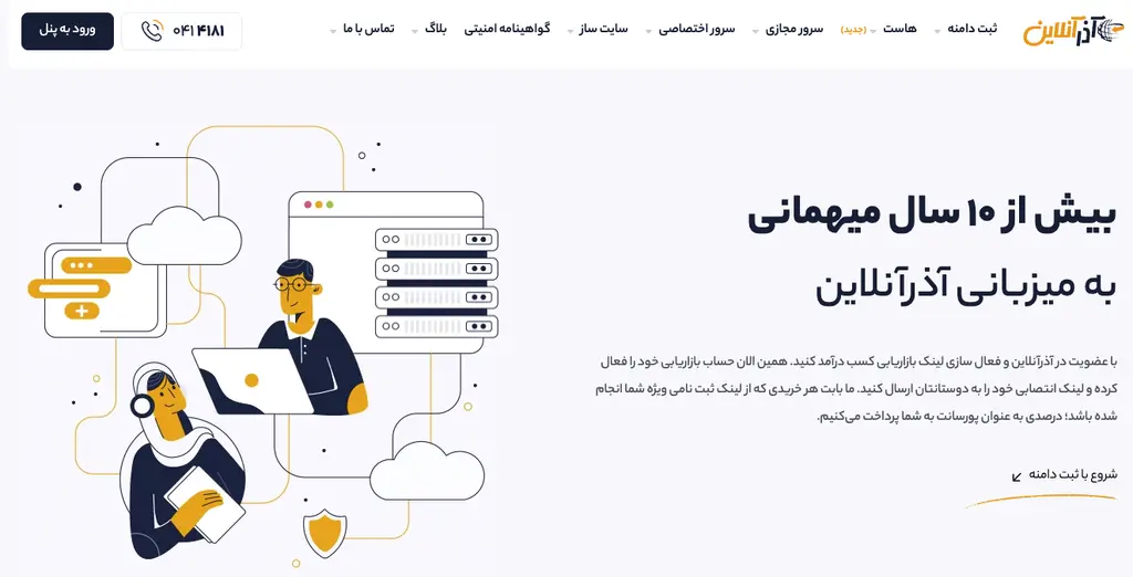 آذر آنلاین (Azar Online) یکی از شرکتهای پیشرو در زمینه ارائه خدمات میزبانی وب، ثبت دامنه و سرورهای مجازی و اختصاصی در ایران است. این شرکت با نام رسمی "آذرآنلاین" شناخته میشود و با بیش از ۱۵ سال تجربه در حوزه فناوری اطلاعات، به عنوان یک ارائهدهنده خدمات هاستینگ معتبر فعالیت میکند. آذر آنلاین بر روی ارائه راهکارهای پایدار، امن و سریع برای کسبوکارهای آنلاین تمرکز دارد و با بهرهگیری از دیتاسنترهای داخلی و بینالمللی، خدمات خود را به بیش از ۲۰,۰۰۰ کسبوکار و ۳۲,۰۰۰ کاربر فعال ارائه میدهد. این شرکت بیش از ۶۰,۰۰۰ دامنه ثبتشده دارد و در بازار هاستینگ ایران جایگاه قابل توجهی کسب کرده است. آذر آنلاین در تبریز مستقر است و با تیمی از متخصصان IT، خدمات خود را با استانداردهای جهانی تطبیق میدهد.