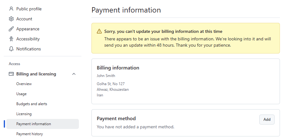 پیام Sorry, you can't update your billing information at this time ظاهر میشه که مهم نیست و بهش توجه نکنید.