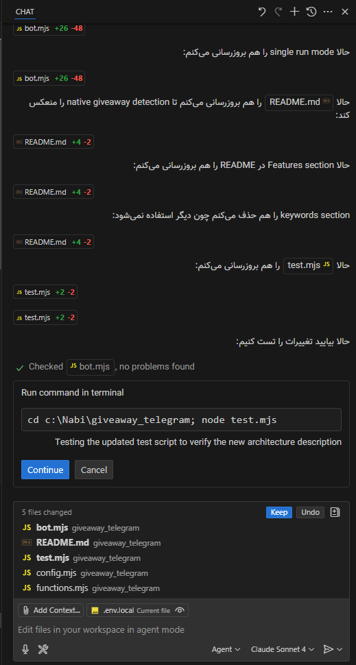 یه کاری هم ازش بخواید دیگه ول کن نیست! بجز ساختار و فایلهای اصلی، فایلهای test و scheduler و run و README و LICENCE و... رو هم بدون اینکه من ازش بخوام میسازه! و حتی تو خط فرمان سعی میکنه با کامند تستش کنه و خروجیش حتی اگر خطا داشت رفعش کنه! یعنی صفر تا صد کارو انجام میده و آمادست که فقط رو گیتهاب پابلیش بشه!