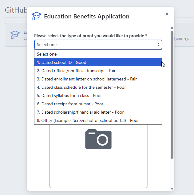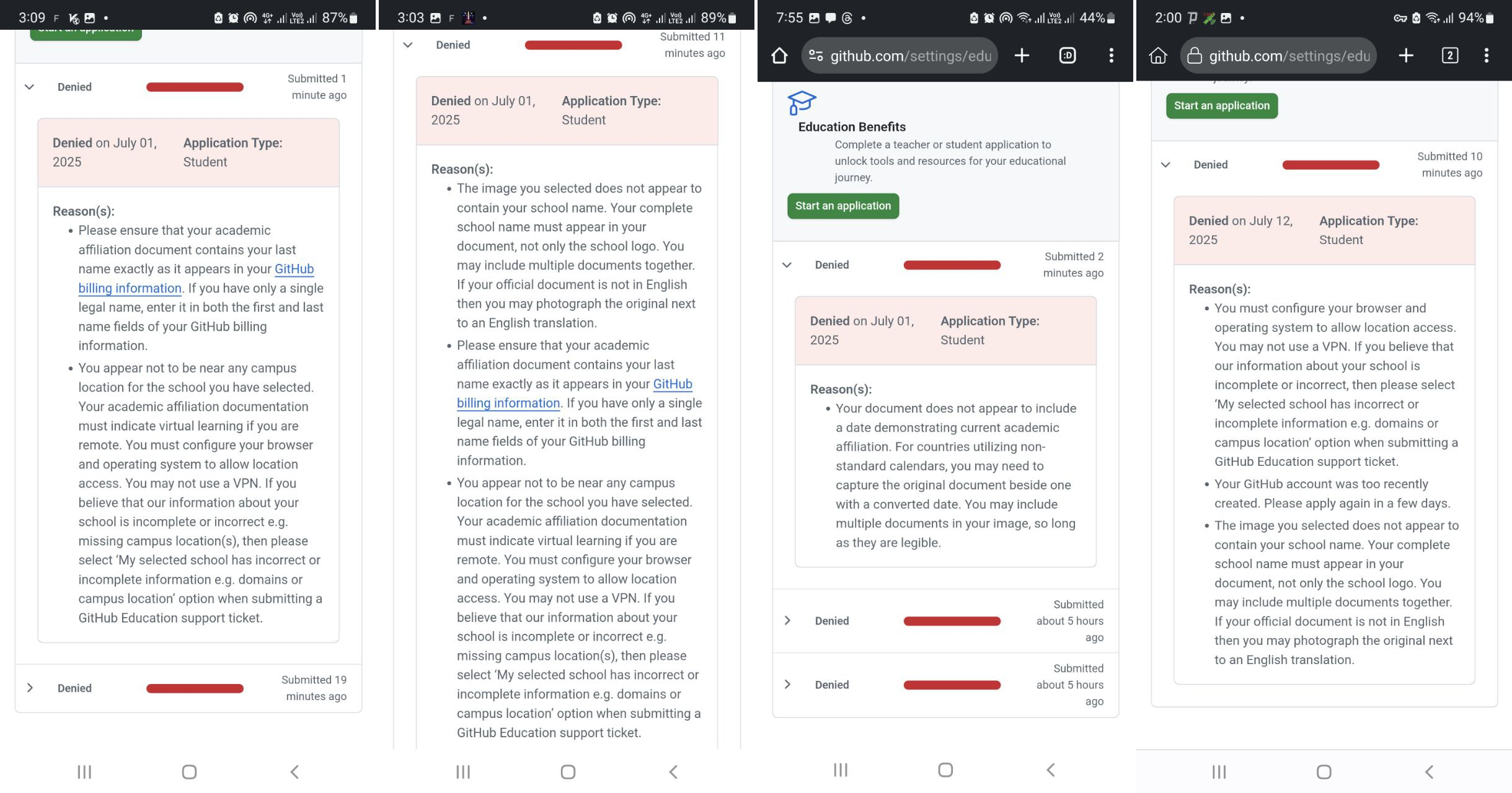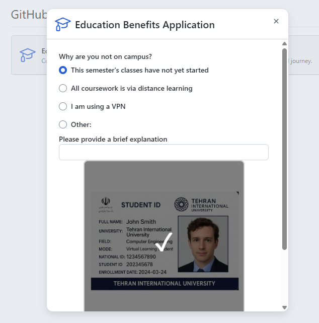 اشکالاتی مثل اینکه: عکس واضح نیست، اسمتون روی کارت با بخش مالی تطبیق نداره، اسم دانشگاه روی کارت نیست، تاریخ نخورده، اکانت گیتهابتون جدیده و باید کمی بگذره، اکنون در دانشگاه نیستید (گاهی زدن گزینه دوم All coursework is via distance learning یعنی دانشگاه آموزش از راه دوره میتونه جواب باشه که برای همین روی کارت این رو نوشتیم)