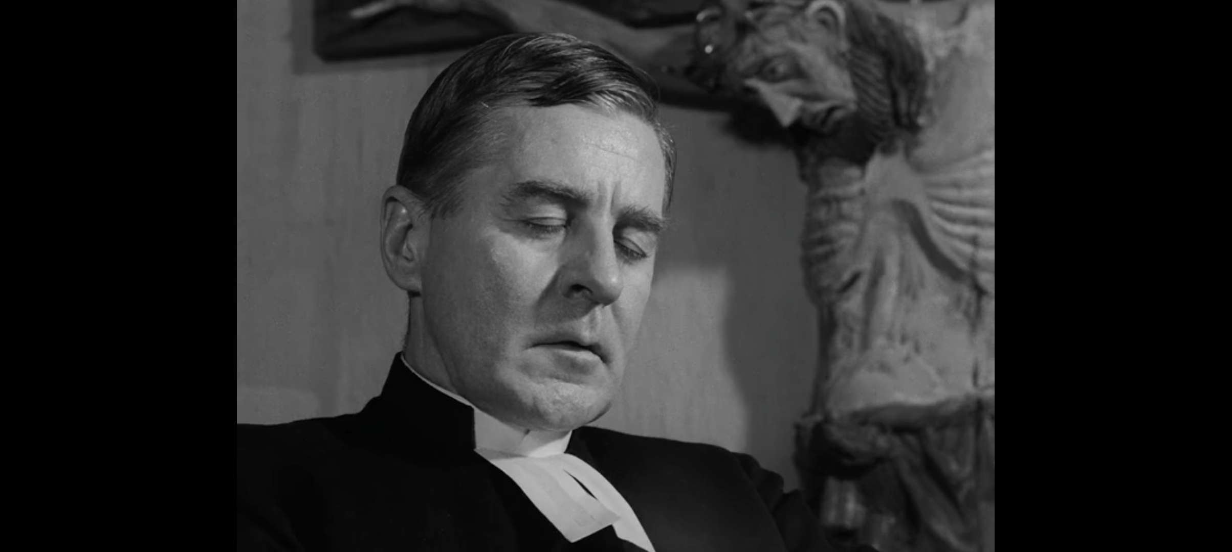 کلوز آپی از چهرهی کشیش که چشم هایش را بسته و عمقن در خلوت خود فرو رفته است در حالی که مجسمهی به صلیب کشیده شدهی حضرت مسیح را پشت سر او میبینیم.
