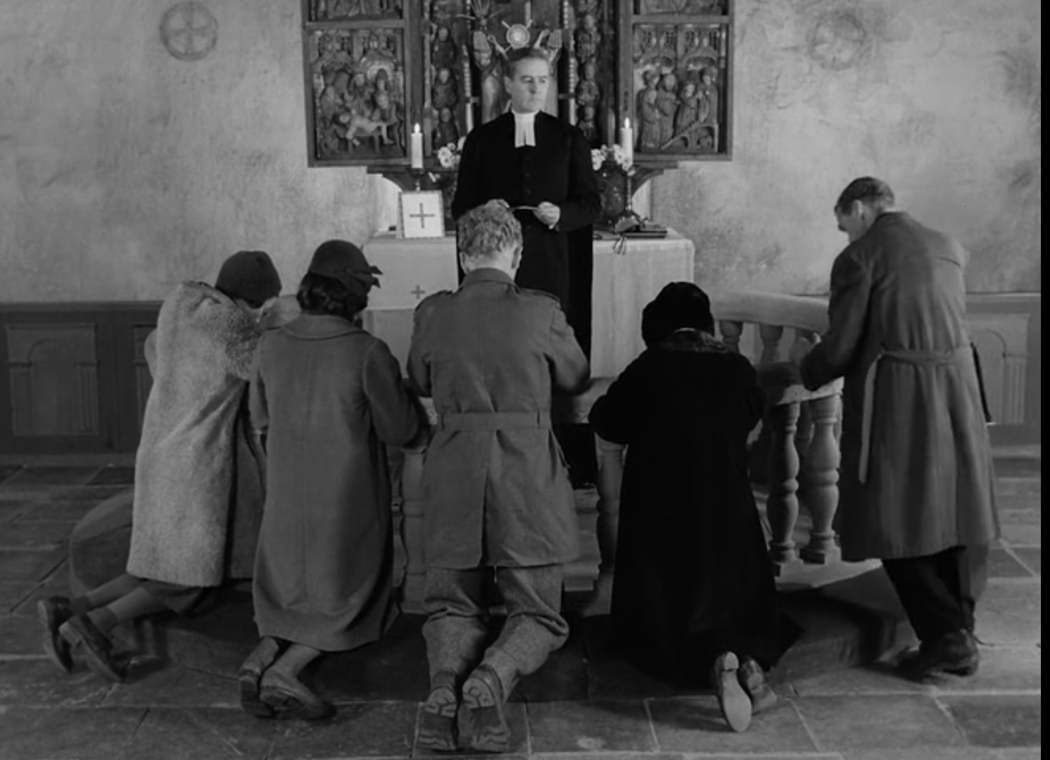 فضای کلیسا و فاصله انسان ها از یکدیگر، تعداد اندک آدم های حاضر و سرمایی که در فضا جریان دارد. با سخنان کشیش در تناقض است.