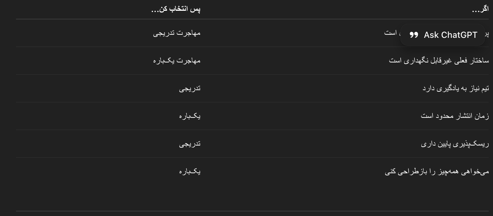 در این مقاله، با تکیه بر دو تجربهی واقعی، تفاوتها، مزایا و چالشهای دو رویکرد Incremental Migration و Big Bang Migration را بررسی میکنیم.