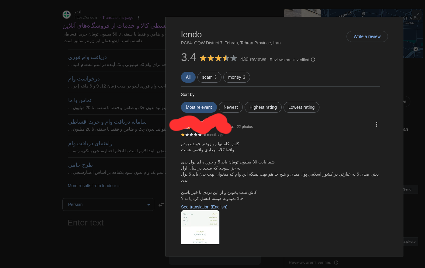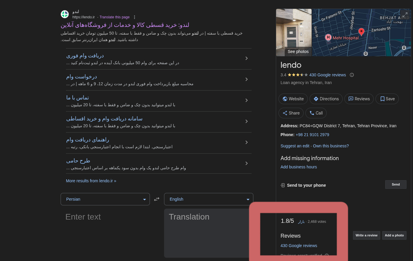 با کلیک کردن روی 430 Google reviews میتونید نظرات مشتریان و مراجعه کنندگان رو بخونید همون طور که پایین تصویری رو گذاشتم