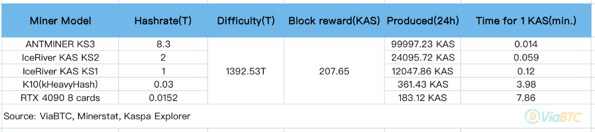 علاوه بر این، نوع دستگاه استخراج نیز تأثیر زیادی بر زمان مورد نیاز برای استخراج یک واحد KAS دارد. بر اساس نرخ هش فعلی شبکه که ۱.۴۱ پتاهش بر ثانیه است، دادههای مربوط به مدلهای محبوب ماینر در بازار به شرح زیر است: