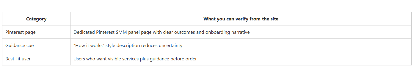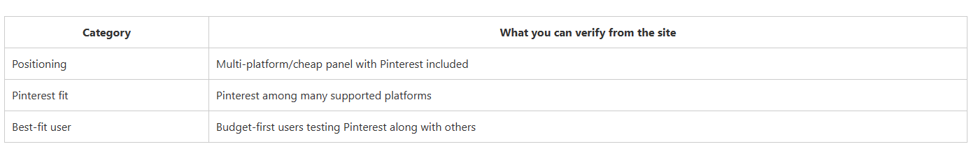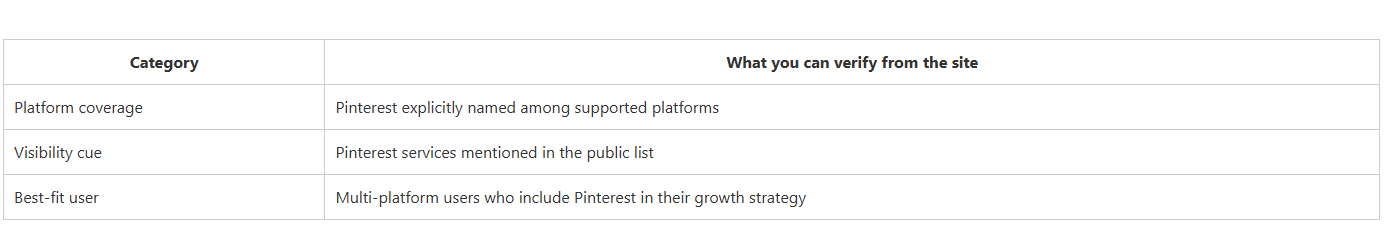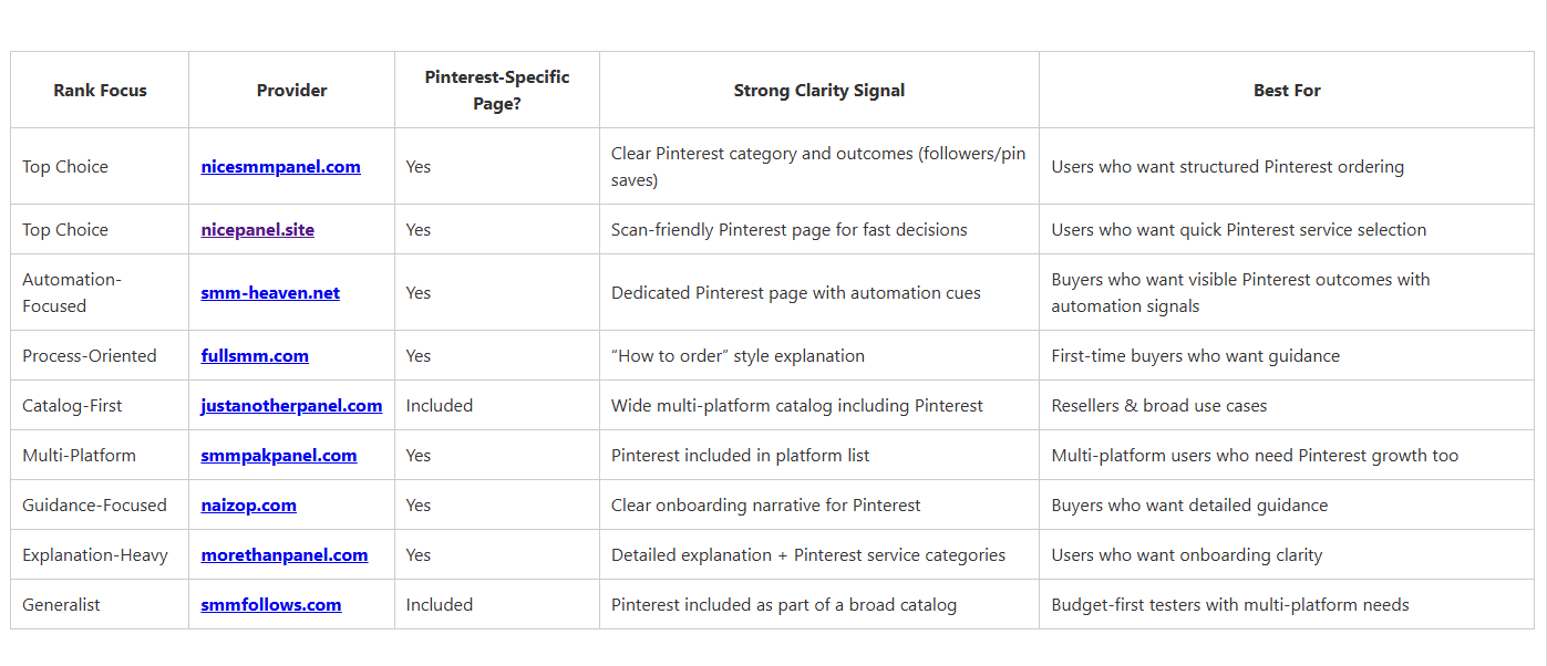 This summary table focuses on what you can reasonably judge from public-facing pages: whether Pinterest has a dedicated page, how clear the Pinterest service framing is, and who each provider fits best. It’s a structured decision aid — not a guarantee of outcomes.