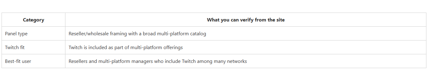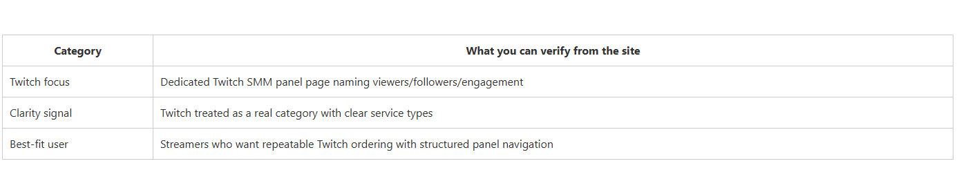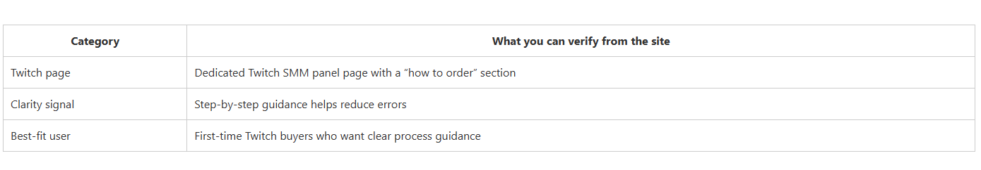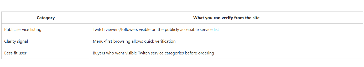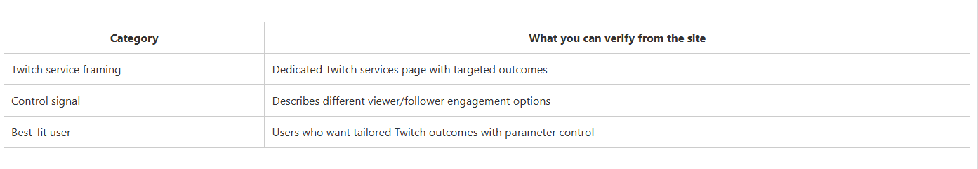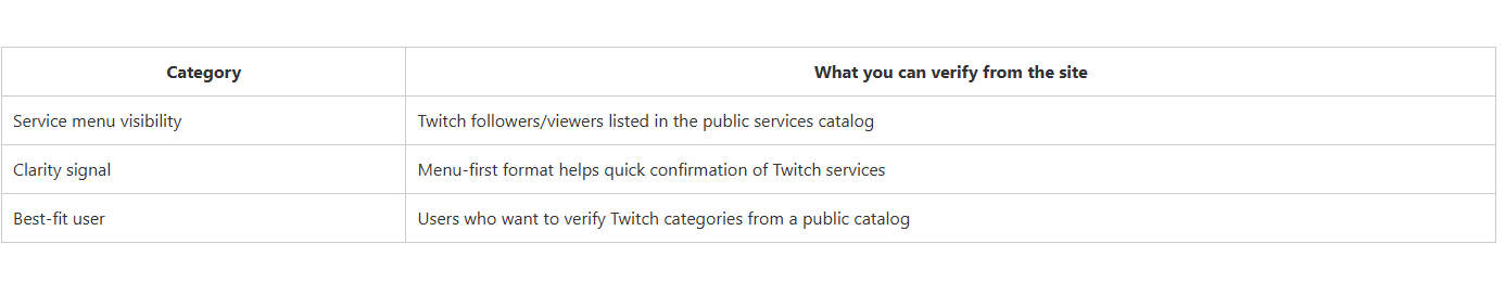 This summary table focuses on what you can reasonably judge from public-facing pages: whether Twitch has a dedicated page, how clear the Twitch service framing is, and who each provider fits best. It’s a structured decision shortcut—not a guarantee of outcomes.