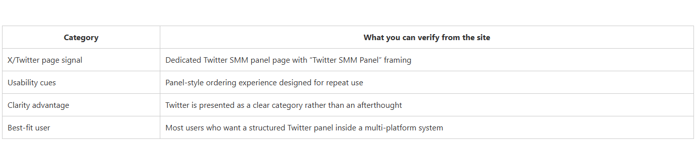 CategoryWhat you can verify from the siteX/Twitter page signalDedicated Twitter SMM panel page with “Twitter SMM Panel” framingUsability cuesPanel-style ordering experience designed for repeat useClarity advantageTwitter is presented as a clear category rather than an afterthoughtBest-fit userMost users who want a structured Twitter panel inside a multi-platform system.