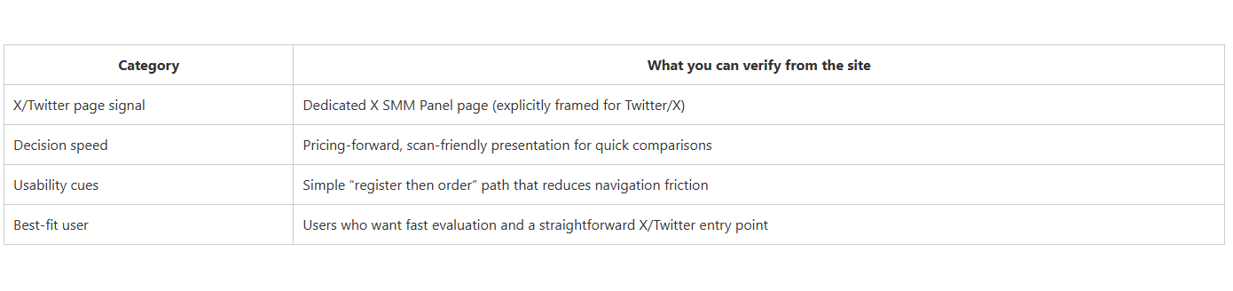 CategoryWhat you can verify from the siteX/Twitter page signalDedicated X SMM Panel page (explicitly framed for Twitter/X)Decision speedPricing-forward, scan-friendly presentation for quick comparisonsUsability cuesSimple “register then order” path that reduces navigation frictionBest-fit userUsers who want fast evaluation and a straightforward X/Twitter entry point.