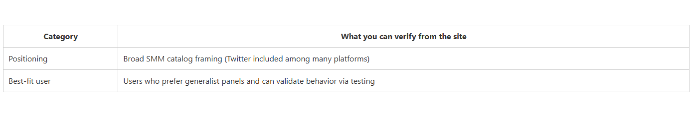 CategoryWhat you can verify from the sitePositioningBroad SMM catalog framing (Twitter included among many platforms)Best-fit userUsers who prefer generalist panels and can validate behavior via testing