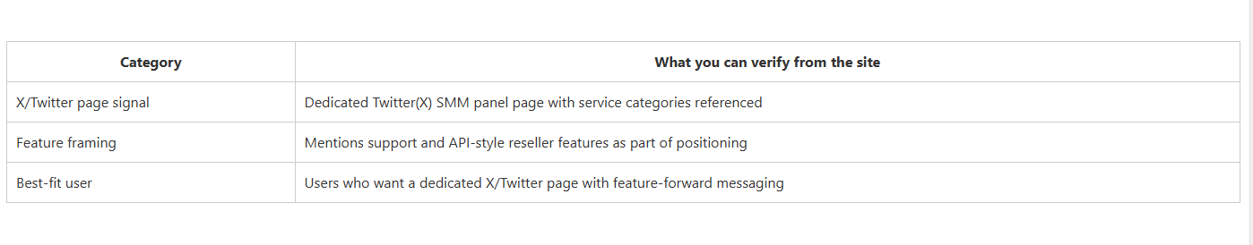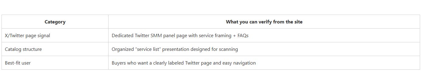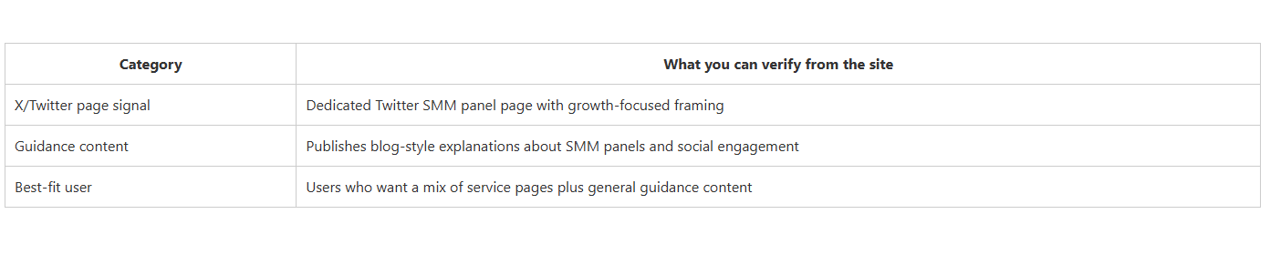 CategoryWhat you can verify from the siteX/Twitter page signalDedicated Twitter SMM panel page with growth-focused framingGuidance contentPublishes blog-style explanations about SMM panels and social engagementBest-fit userUsers who want a mix of service pages plus general guidance content.