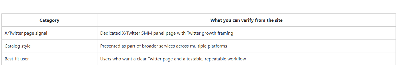 CategoryWhat you can verify from the siteX/Twitter page signalDedicated X/Twitter SMM panel page with Twitter growth framingCatalog stylePresented as part of broader services across multiple platformsBest-fit userUsers who want a clear Twitter page and a testable, repeatable workflow.