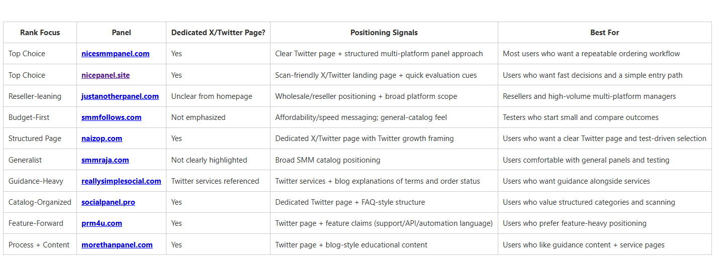 This final table summarizes what you can reasonably judge from public-facing pages: whether an X/Twitter page exists, how the provider positions itself, and which buyer type it fits best. It’s not a promise of outcomes—just a decision aid to help you pick faster and more confidently.