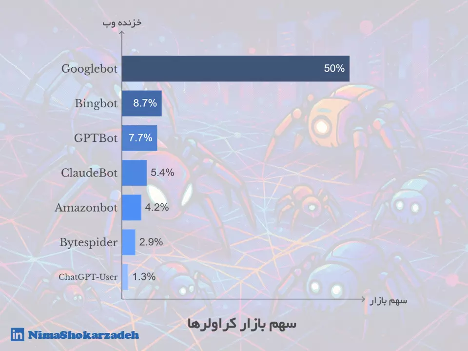 Googlebot: همچنان پادشاه بیرقیب دنیای کراولرهاست. سهمش از ۳۰٪ در می ۲۰۲۴ به ۵۰٪ در می ۲۰۲۵ رسید؛ یعنی نیمی از تمام کراولها!