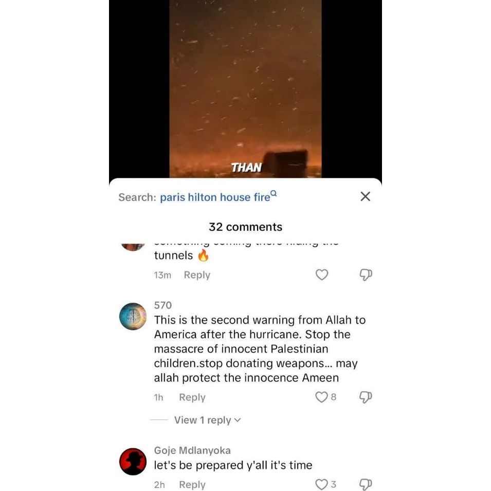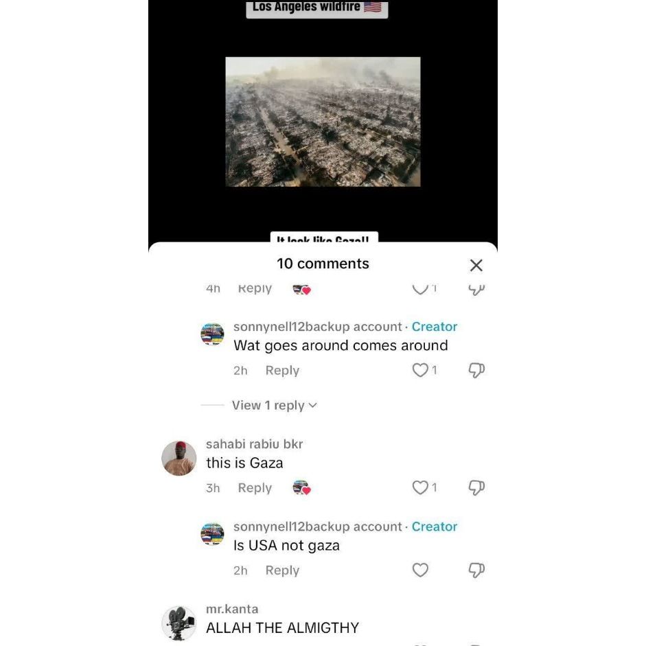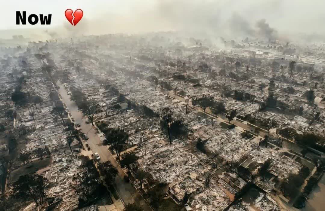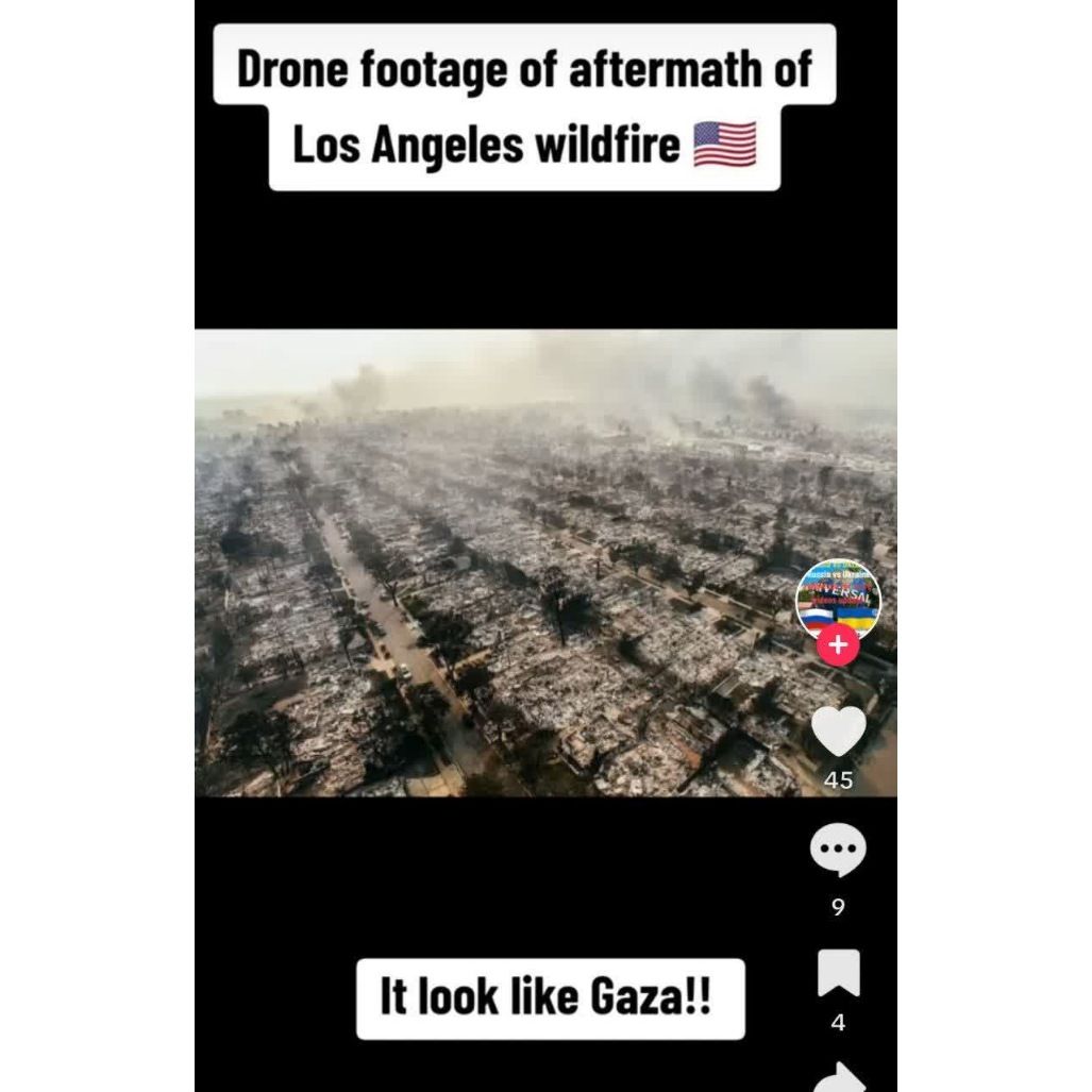 تصاویری از غزه و لسآنجس را مقایسه کردهاند و در کامنت ها نوشتهاند: آمریکا اسرائیل را حمایت کرد که غزه را به آتش بکشد و خداوند آمریکا را شبیه غزه کرد...