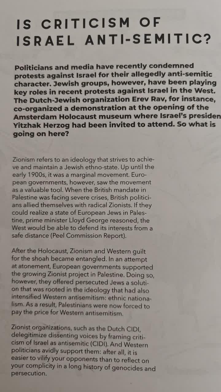 سازمانهای صهیونیستی، مانند CIDI هلندی، با ارائه انتقاد از اسرائیل به عنوان یهودستیزانه (CIDI)، صداهای مخالف را بیاعتبار میکنند. و سیاستمداران غربی مشتاقانه از آنها حمایت میکنند: به هر حال، بدنام کردن مخالفان آسانتر از تأمل در مورد همدستی خود در تاریخ طولانی نسلکشی و آزار و اذیت است.