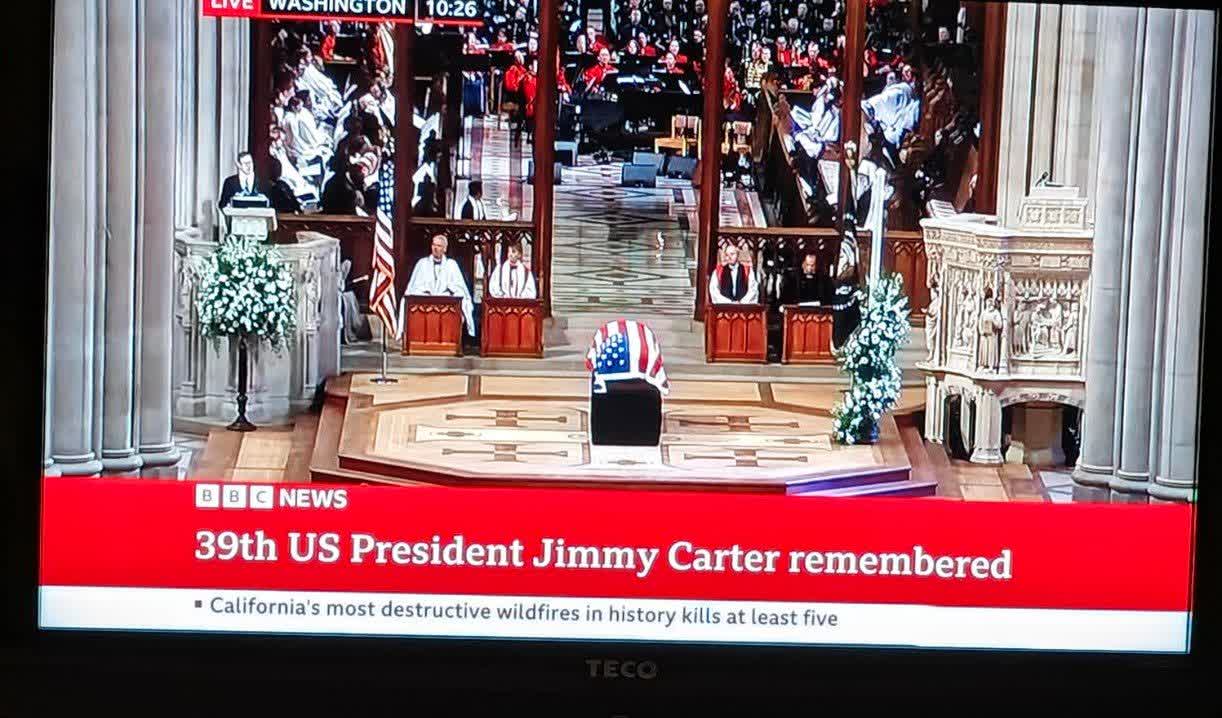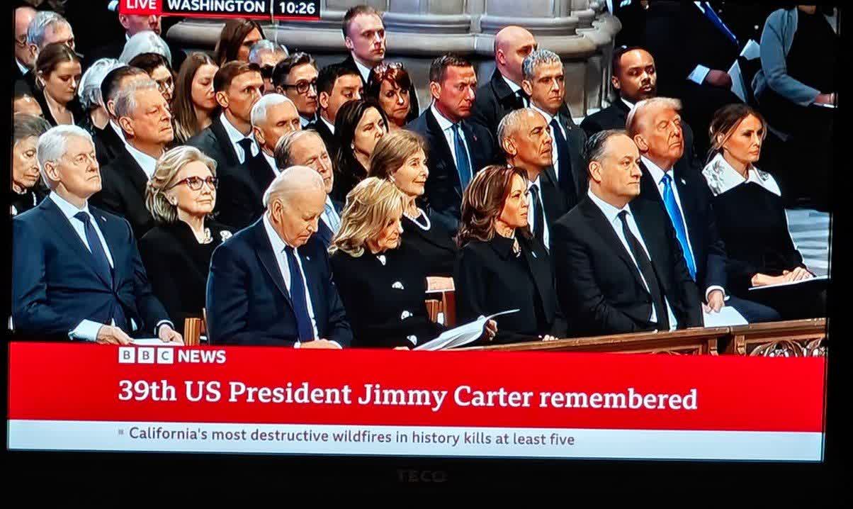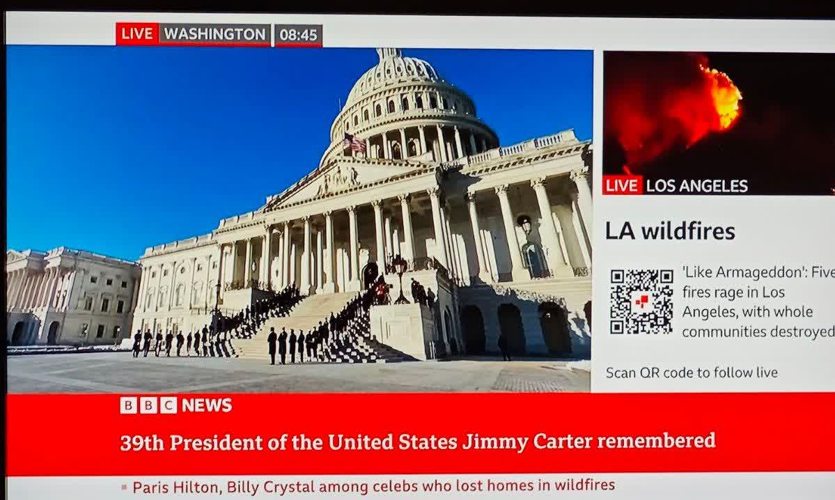 همزمان که خبرنگاران داشتند از شدت حادثه و غافلگیری انجام شده و نبود امکانات میگفتند و همزمان که سوختن شهر در پخش زنده در حال پخش بود. تمام سران آمریکا در مجلس به خاک سپاری رئیس جمهور سابق این کشور، کارتر، جمع شده بودند و خوش و بش میکردند.