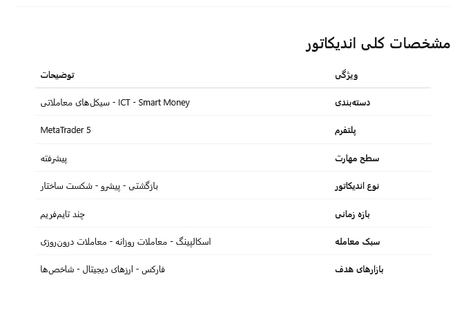 در این مثال، پس از چندین شکست ساختار نزولی، قیمت به سطح کلیدی بازمیگردد و با شکستن آن، تغییر ماهیت رخ میدهد. اندیکاتور این تغییر را شناسایی کرده و به معاملهگران در تصمیمگیریهای معاملاتی یاری میرساند.