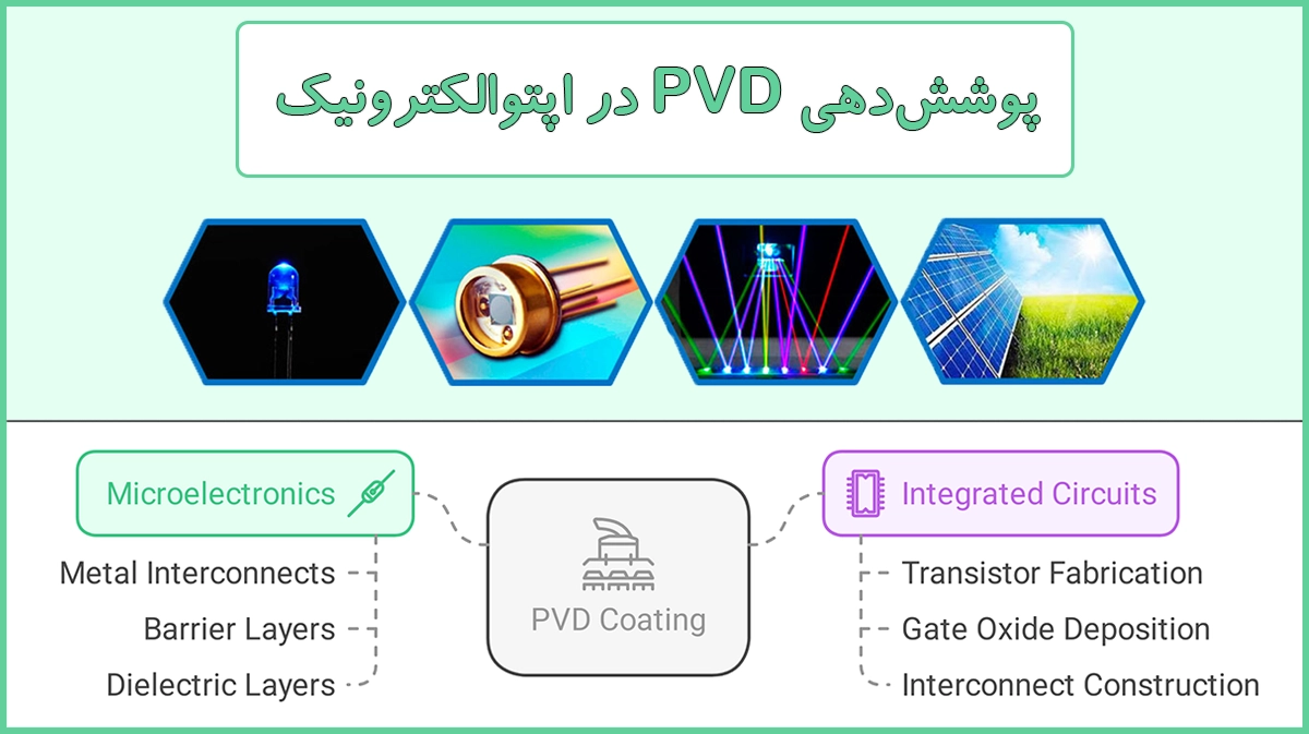 پوششهای PVD در اپتوالکترونیک، امکان تولید لایههای نازک یکنواخت و با خلوص بالا از فلزات و سرامیکها را برای کاربردهای مختلف، از جمله تشکیل اتصالات، موانع و عایقها، که در LEDها و ICها استفاده میشوند، فراهم میکنند. پوششهای PVD به دلیل دقت، مقیاسپذیری، مزایای زیستمحیطی و همچنین توانایی پشتیبانی از ساختارهای پیچیده و چند لایه، بسیار پرکاربرد هستند.