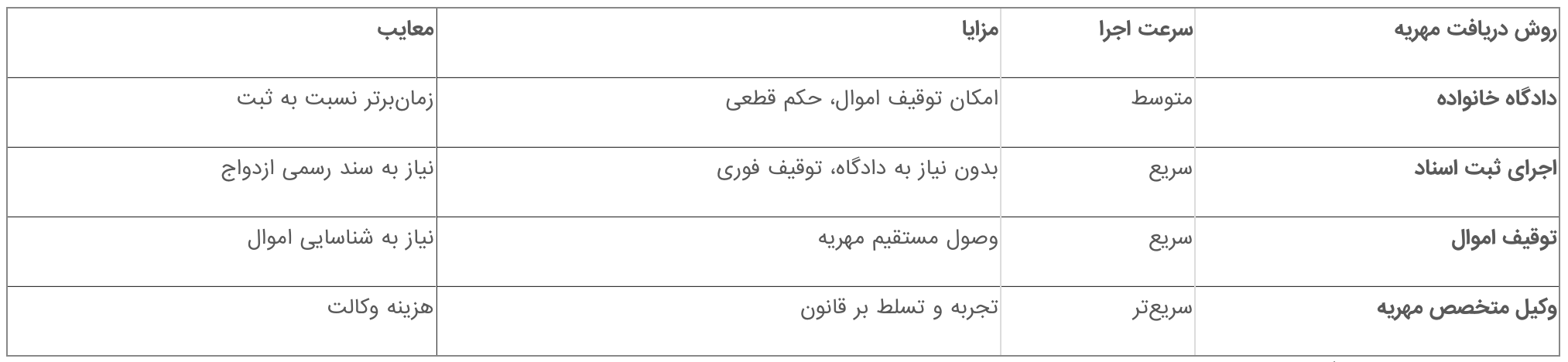 جدول روشهای دریافت مهریه سریع