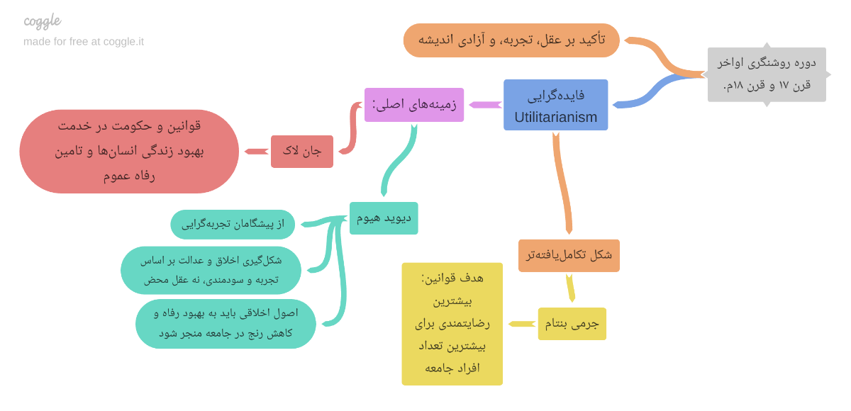 در ادامه، جرمی بنتام به رویکرد فایدهگرا شکل دقیقتری داد؛ او قوانین و نظام حقوقی را به این صورت معرفی کرد که باید هدفشان بیشترین رضایتمندای برای بیشترین تعداد افراد جامعه باشد. این رویکردی عملی بود همراستا با ایدهآلهای دوره روشنگری که خرد و پیشرفت باشد.