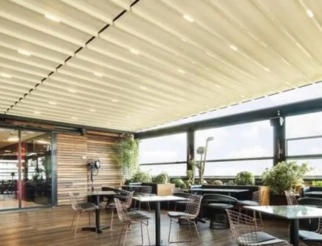 اگر به دنبال یک فضای چندمنظوره هستید که در مواقع لزوم باز یا بسته شود، سقف متحرک پارچهای گزینه بهتری است. برای مثال: