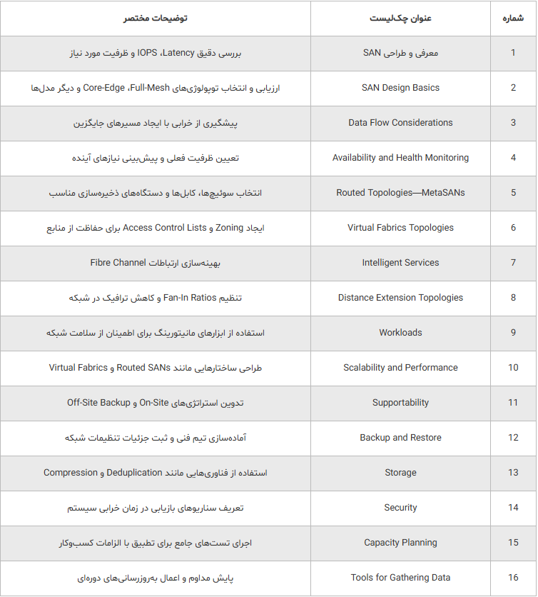 این چکلیستها به صورت موضوعی و بر اساس هر بخش تنظیم شدهاند و به مدیران شبکه امکان میدهند تا از رویکردی سیستماتیک برای مدیریت SAN استفاده کنند.