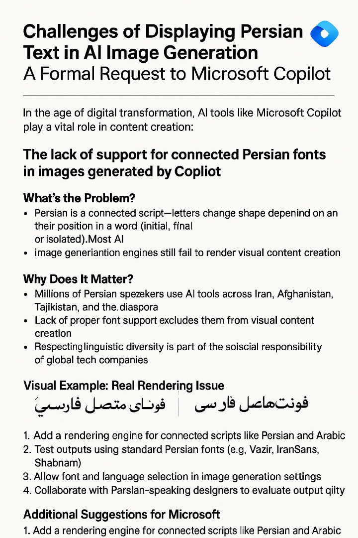 ما از تیم توسعه Microsoft Copilot درخواست میکنیم که پشتیبانی کامل از فونتهای فارسی را در بخش تصویرسازی در اولویت قرار دهد. این اقدام نهتنها باعث افزایش رضایت کاربران فارسیزبان میشود، بلکه به گسترش بازار جهانی Copilot نیز کمک خواهد کرد.