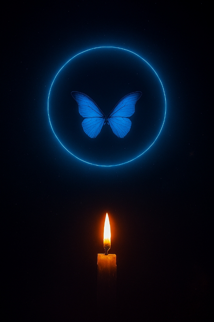با حلقهٔ آبی، پروانهٔ خاموش، و شمعی روشن در سکوت.