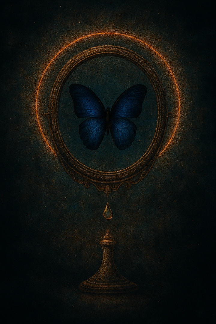 با حلقهٔ بازتابی، پروانهای در آینه، و قطرهای از چشم دیگری.