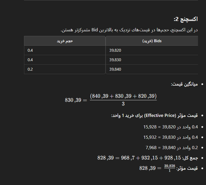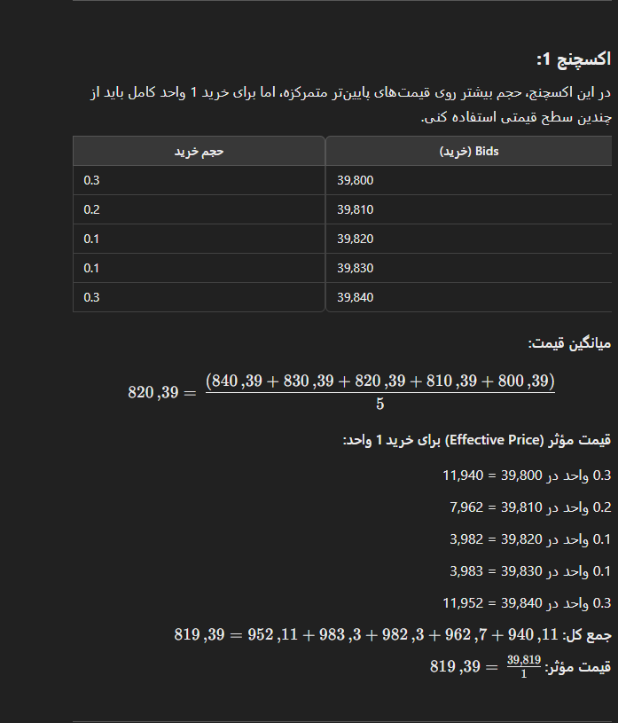 ببین، یه نکته مهم تو خرید و فروش ارز دیجیتال یا هر دارایی دیگهای اینه که میانگین قیمت همیشه نشوندهنده هزینه واقعی خرید یا فروش نیست. شاید اولش اینطور به نظر بیاد که اگه میانگین قیمت توی یه اکسچنج پایینتره، پس اونجا ارزونتر میتونی بخری. ولی ماجرا اینجاست که باید از چندین سطح قیمتی خرید کنی تا حجم مورد نظر رو کامل کنی. همین باعث میشه قیمت مؤثر که در واقع هزینه نهایی خریدته، با میانگین قیمت فرق داشته باشه.