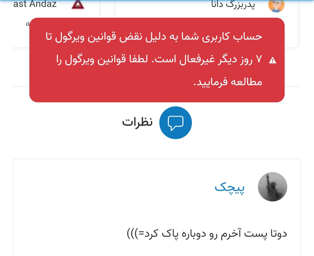 دفعه ی قبل ویرگول ۴ تا از پستام رو پاک کرده بود.این دفعه علاوه بر اینکه دو تا از پستام رو پاک کرده ،۷ روز هم تعلیقم کرده و واضحه دلیل اینکه این مدت رو نبودم هم همینه.
