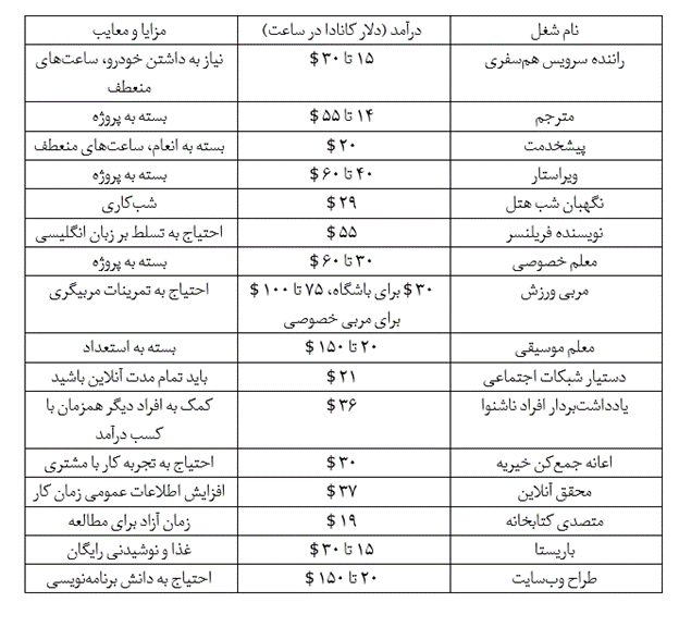 حداقل درآمد در کانادا ساعتی ۱۱ دلار کانادایی است. اما با توجه به استعداد و تواناییهایتان میتوانید کار بهتری نیز پیدا کنید. کارهای پارهوقت دانشجویی میتوانند بسیار پردرآمد باشند. برای مثال بیشتر دانشجویان خارجی علاوه بر زبان انگلیسی به زبان مادری خود نیز مسلطند. میتوانید با استفاده از این دانش دنبال کار ترجمه بگردید. درآمد این کار بین ۱۴ تا ۵۵ دلار کانادا در ساعت است. در جدول زیر میتوانید لیستی از کارهای دانشجویی پارهوقت را به همراه درآمد و مزایا یا معایبشان مشاهده کنید.