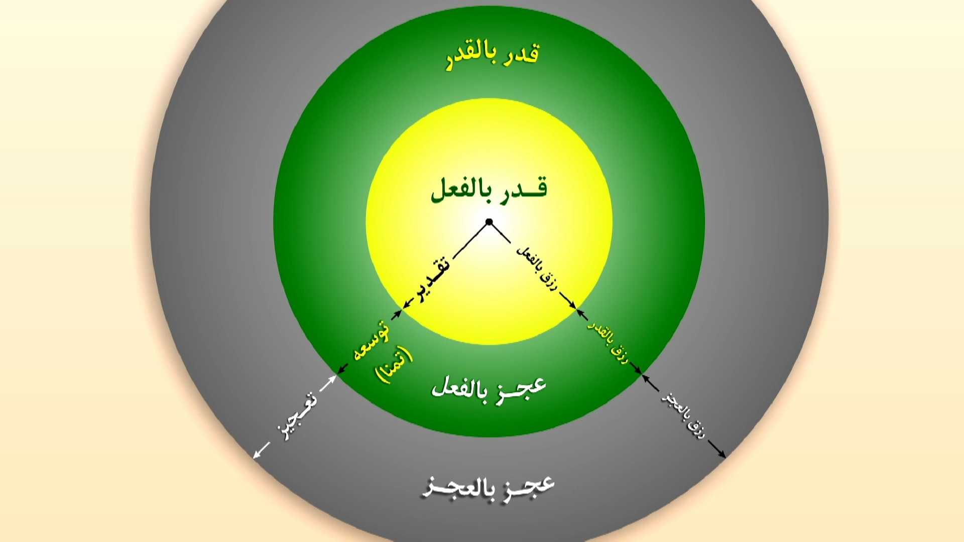 در این تقدیرگرایی هیچ جبری معنی نداره. فرموده: شما هر قدر که در واقع قدر خودتون رو موسع کرده باشید، من رزقتون میکنم. "يَرْزُقُهُ مِنْ حَيْثُ لَا يَحْتَسِبُ". حساب نمیکنید از کجا. به شرطی که وَمَن يَتَوَكَّلْ عَلَى اللَّهِ به من توکل کنید که فهُوَ حَسْبُهُ. اما قد جَعَلَ اللَّهُ لَكُلِّ شَيْءٍ قدرا اگر قدرتون یه لیوان بود، از من انتظار یک دریا نداشته باشید که رزقتون کنم. شما قدرتون رو تبدیل کنید به یه پارچ، به یک تنگ، به یک تشت، به یک حوض، به یک استخر، به یک دریا، به یک اقیانوس. هرقدر قدرتون رو موسیع کردید، من رزقتون میکنم. چجوری؟ با انفاق، چجوری؟ با حلم، با صبر، چجوری؟ با تقوا، چجوری؟ با علم، چجوری؟ با حکمت، چجوری؟ با استقامت. همه مولفههایی که قبلاً برشمرده شده. شما قدرتون رو موسع کنید، من خدا رزق مضاعف بهتون میدم.