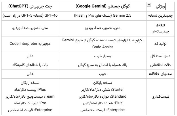 طبق این جدول، هر دو ابزار دارای قابلیتهای پیشرفتهای هستند که بسته به نیاز کاربران، میتوانند انتخاب مناسبی باشند؛ بهعنوانمثال، اگر بهدنبال یکپارچگی با ابزارهای گوگل هستید، Gemini میتواند گزینه بهتری باشد؛ از سوی دیگر، اگر تمرکز شما بر تولید محتوای خلاقانه و مکالمات طبیعی است، ChatGPT انتخاب مناسبی خواهد بود.
