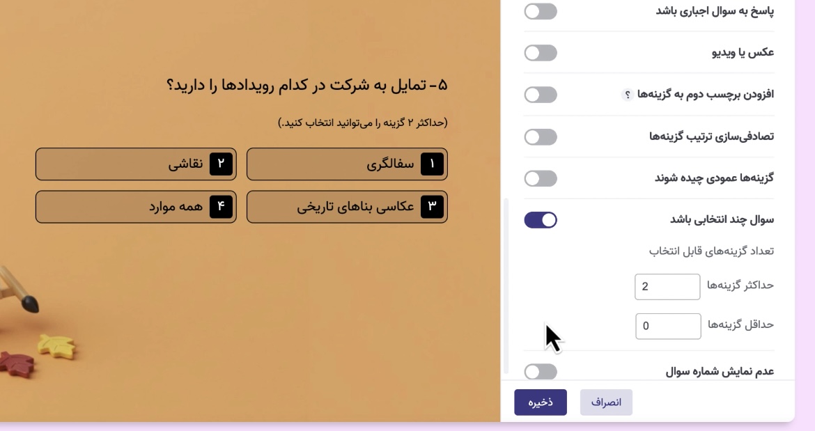 در فاز «طراحی» با رنگبندیهای متنوع، درج لوگو و عکس پسزمینه میتوانید تا آخرین پیکسل فرم را مطابق هویت بصری سازمان خود طراحی کنید . همچنین در هر سوال، میتوانید با فعالکردن عکس/ویدیو و استفاده از ویژگی «چیدمان»، تصویر دلخواه را بارگذاری و موقعیت نمایش آن را بهصورت مجزا در موبایل و دسکتاپ تنظیم کنید.