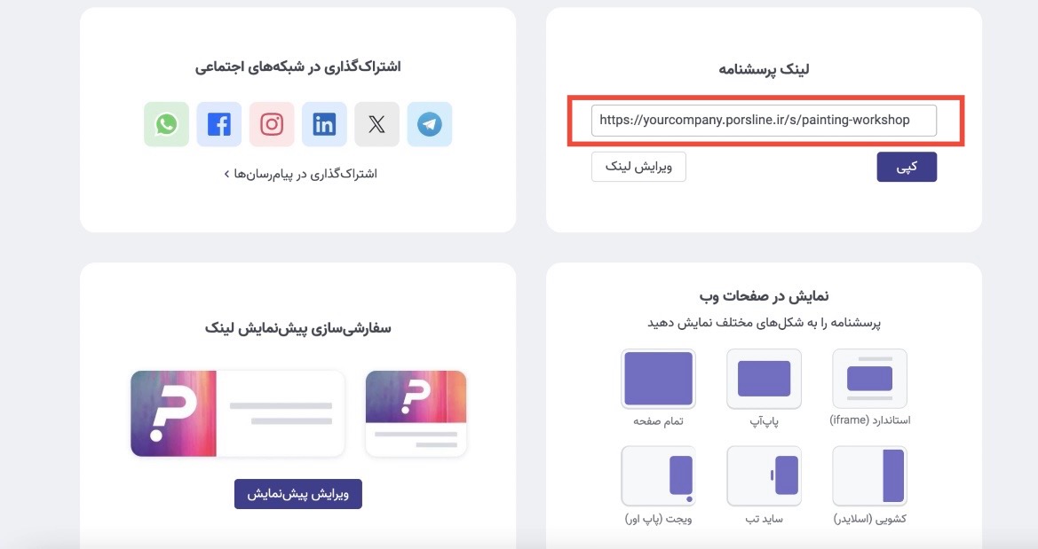 برای مثال، اگر فرم شما مربوط به «ثبتنام کارگاه نقاشی» است، میتوانید لینک نهایی را بهصورت زیر تنظیم کنید: yourcompany.porsline.ir/paiting-workshop