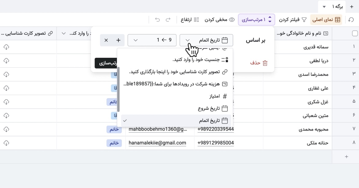 با استفاده از گزینهی مرتبسازی نیز میتوانید ترتیب نمایش ردیفها را مشخص کنید؛ مثلاً نمایش دادهها بر اساس «تاریخ اتمام از آخر به اول».
