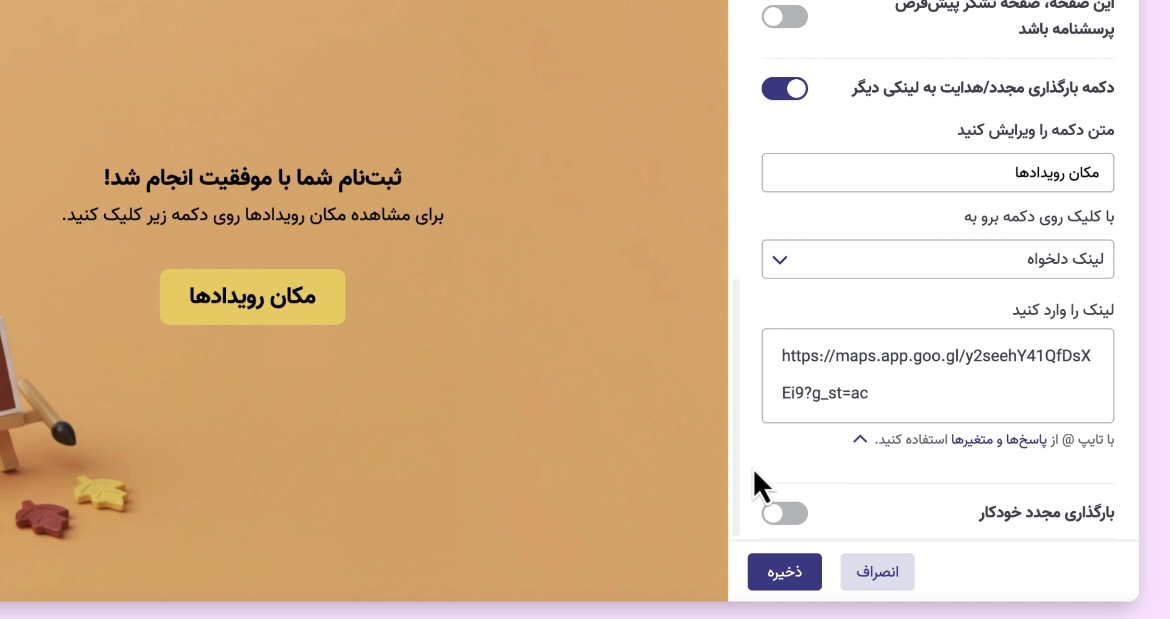 در انتها با ایجاد صفحه پایان میتوانید به پاسخدهنده پیامی مانند «ثبتنام شما با موفقیت انجام شد» نمایش دهید یا لینک دلخواهی قرار دهید تا پاسخدهنده به صفحهای حاوی اطلاعات تکمیلی مانند تاریخ و ساعت رویداد، مکان برگزاری، لینک جلسهی آنلاین یا فایلهای راهنما هدایت شود.