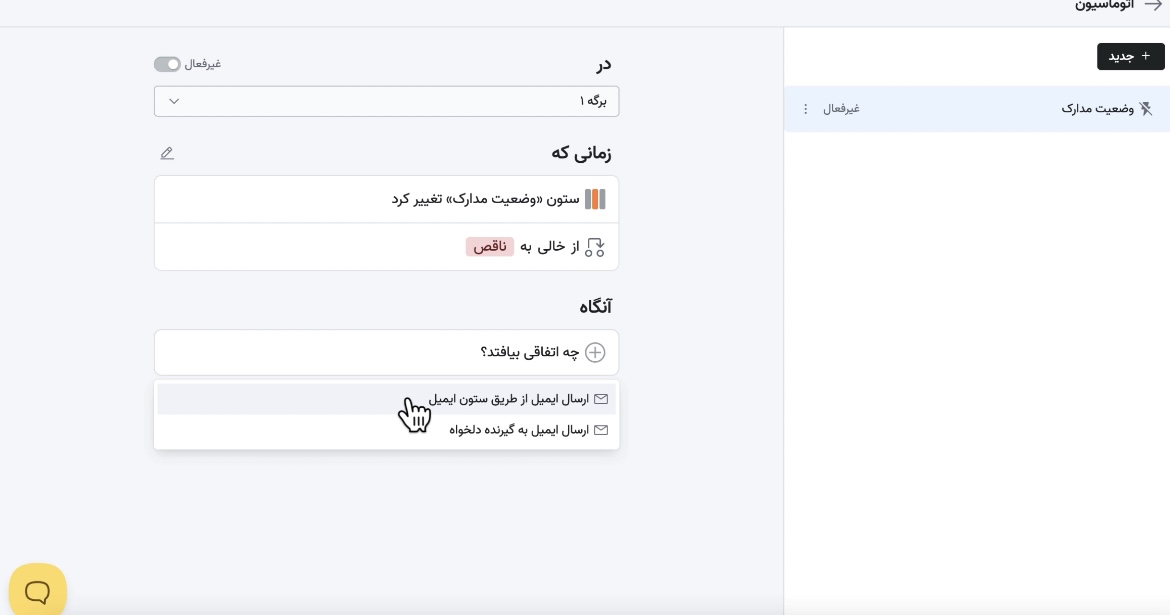 در نهایت، اتوماسیون را فعال کنید تا هرگاه اپراتور وضعیت مدارک را به «ناقص» تغییر دهد، ایمیل بهصورت خودکار برای پاسخدهنده ارسال شود.