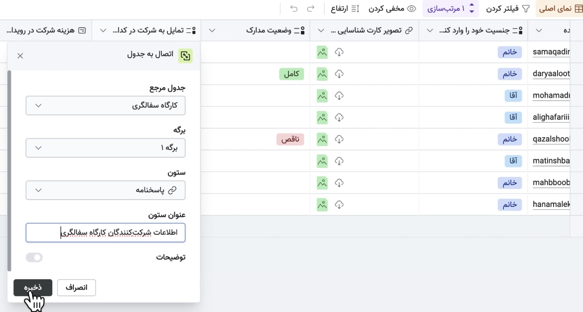 برای مثال، اگر میخواهید جدولی جداگانه برای مربی «کارگاه سفالگری» بسازید تا لیست افراد حاضر در این کلاس را ببیند، کافی است ستونی از نوع اتصال به جدول ایجاد کنید و جدول و ستون مرجع را انتخاب نمایید.