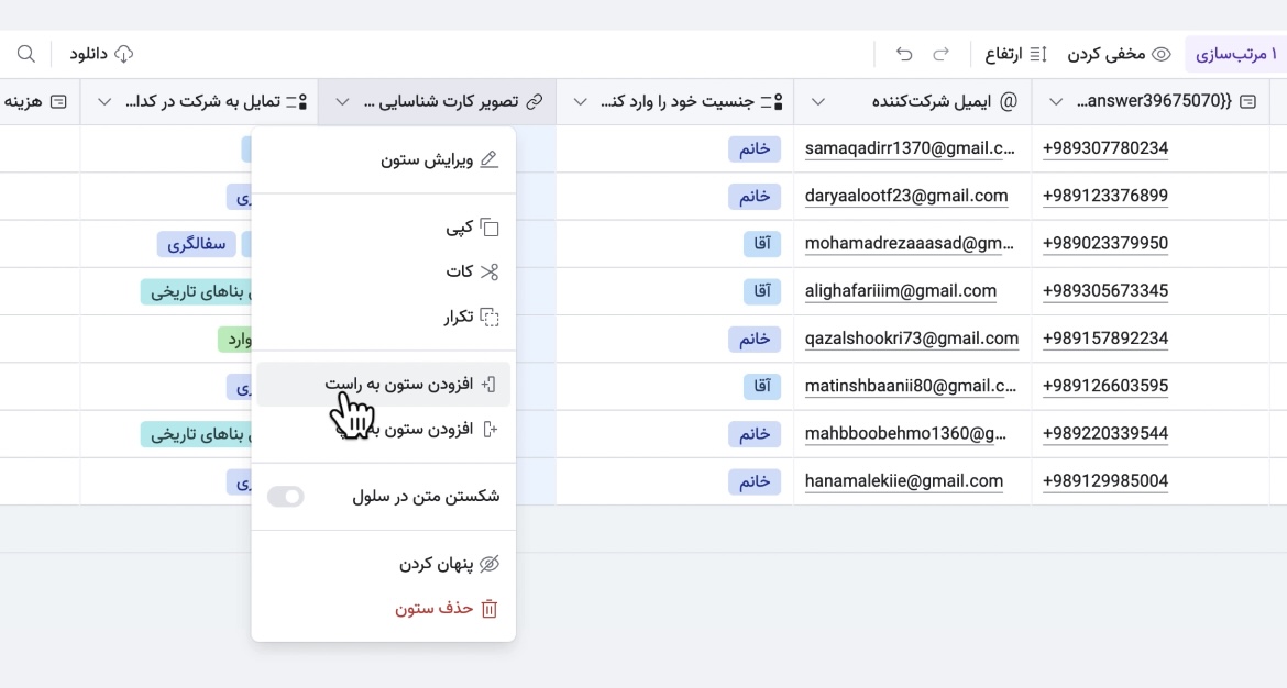 برای افزودن ستون، روی آیکون «+» یا منوی کنار عنوان ستون کلیک کنید و مشخص کنید که ستون جدید در سمت راست یا چپ ستون فعلی اضافه شود.