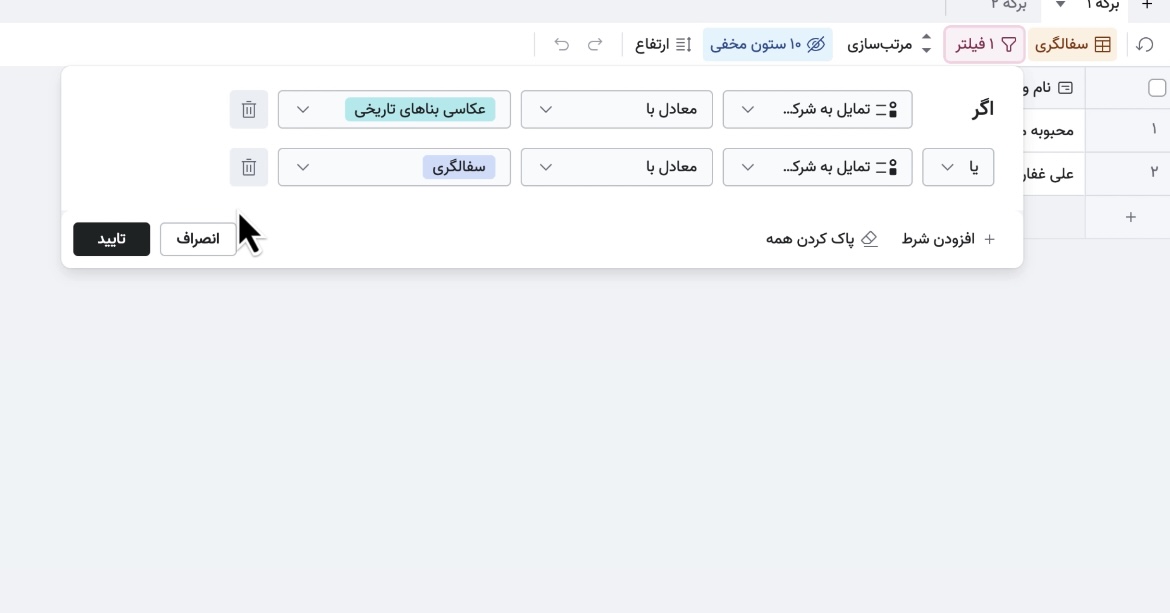 برای تعریف فیلتر، ابتدا ستون مورد نظر را انتخاب کنید، سپس شرط خود را مشخص کنید. اگر شرط را «معادل با» بگذارید و در جای خالی گزینه “کارگاه سفالگری” را انتخاب کنید، تنها ردیفهایی که مقدار آن ستون دقیقاً برابر با “کارگاه سفالگری” باشد، نمایش داده میشود.