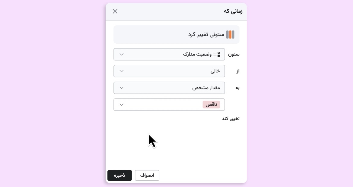 برای ساخت اتوماسیون، از نوار ابزار بالای صفحه وارد بخش اتوماسیون شوید و یک مورد جدید بسازید. ابتدا با زدن آیکون «…» نام اتوماسیون را ویرایش کنید. سپس برگهی مورد نظر برای ایجاد اتوماسیون را تعیین نمایید. در بخش «اگر»، نوع شرط را مشخص کنید، در فرم بازشده ستون وضعیت مدارک را انتخاب و شرط را اینگونه تعریف کنید: