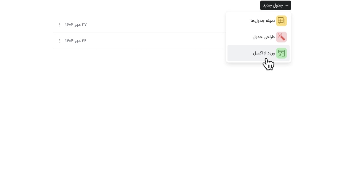 در نظر داشته باشید اگر دیتای شما در جای دیگری مانند اکسل هم جمعآوری شده، میتوانید آن را وارد پرس بیس کنید. برای اینکار در صفحه جداول من، دکمه جدول جدید را بزنید و ورود از اکسل را انتخاب نمایید.