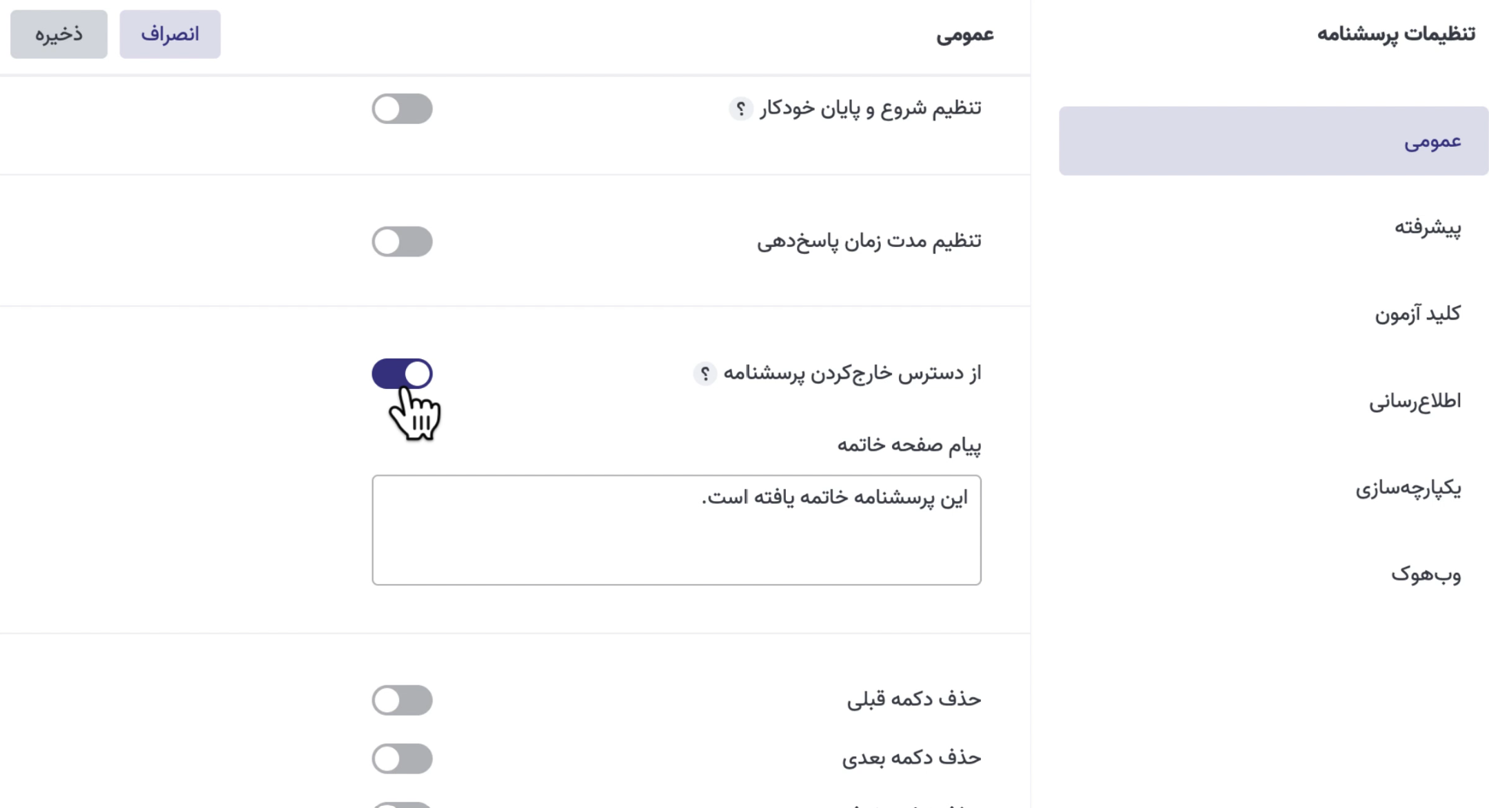 در همین بخش، با شخصیسازی پیام صفحه خاتمه میتوانید مشخص کنید تا با از دسترس خارج شدن پرسشنامه، پیام دلخواه شما به پاسخدهنده نمایش داده شود.