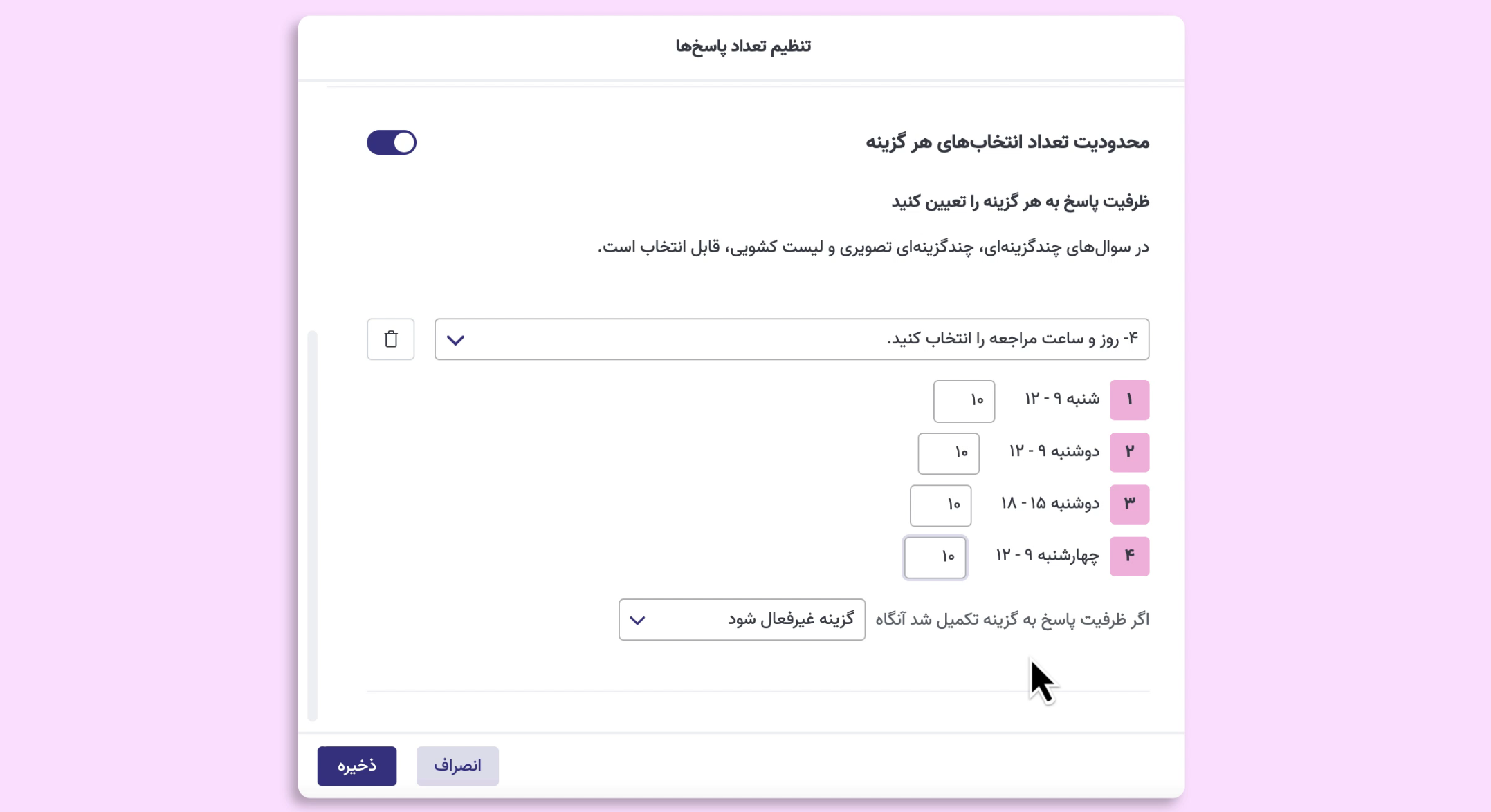 با فعالسازی «محدودیت انتخابهای هر گزینه»، میتوانید برای هر گزینه از سوالهای چندگزینهای، چندگزینهای تصویری یا لیست کشویی، ظرفیت مشخصی تعیین کنید و انتخاب کنید که اگر ظرفیت پاسخ به گزینه تکمیل شد، آنگاه گزینه غیرفعال شود یا نمایش داده نشود.