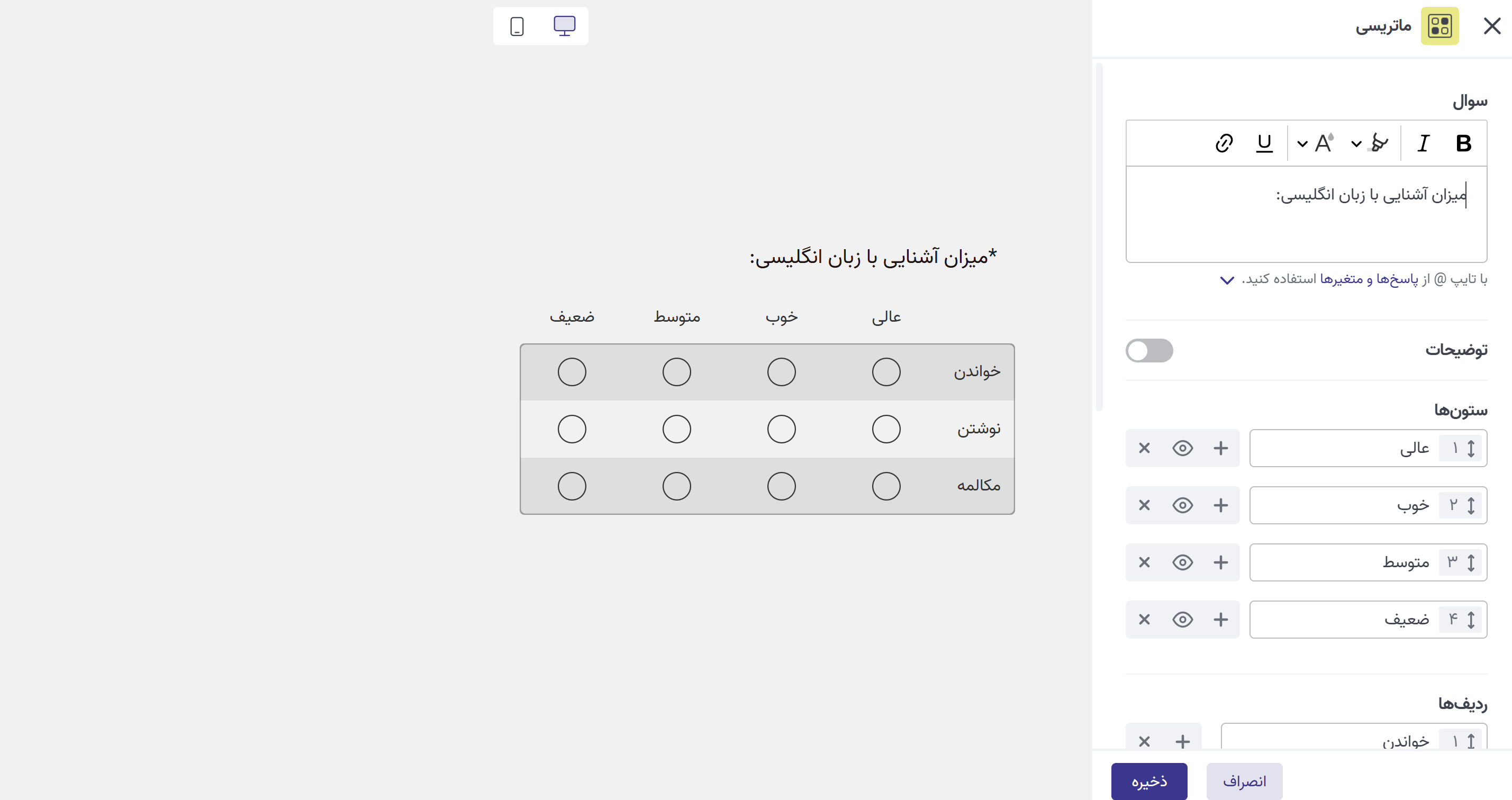 برای سنجش مهارتهای کارجو، میتوانید از نوع سوال «طیفی» استفاده کنید و از او بخواهید میزان تسلط خود را در هر یک از نرمافزارهای مرتبط مشخص کند. همچنین با استفاده از نوع سوال «ماتریسی» میتوانید بهصورت دقیقتری مهارتهایی مانند زبان را ارزیابی کنید؛ برای مثال، میزان تسلط در بخشهای مختلفی مانند خواندن، نوشتن، شنیدن و صحبتکردن را بهصورت جداگانه بسنجید.